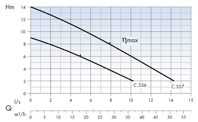 Рабочие кривые насосов Dreno Pompe серии V, модель C.336-337, 2 полюса
