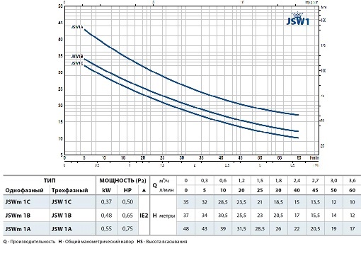 Самовсасывающие насосы Pedrollo JSW1-N - максимально простые в эксплуатации поверхностные насосы с одним рабочим колесом и системой Вентури, способностью к всасыванию воды с глубины до 9 метров и с возможностью перекачивания воды, содержащей воздух. Типоразмеры насосов JSW1 с номинальной мощностью двигателя 0,37, 0,48 и 0,55 кВт. Насосы Pedrollo JSW1 после рестайлинга 2017 года (обозначение в маркировке - N(NEW)) получили новый двигатель и гидравлику с большим коэффициентом полезного действия, что обеспечило повысило общую гидравлическую мощность насоса параллельно с уменьшением затрат электроэнергии.